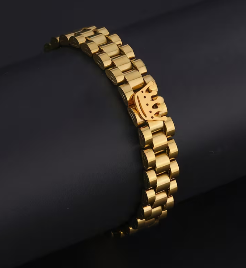 Description Affirmez votre présence avec ce bracelet “Couronne”, une pièce qui symbolise le pouvoir, la réussite et l’élégance absolue. Ce bijou unique marie l’éclat solaire de l’or à un design impérial, centré sur une couronne minutieusement travaillée. Conçu pour celles et ceux qui souhaitent porter un accessoire porteur de sens, ce bracelet transforme chaque geste en une déclaration de confiance. C’est l’atout maître pour rehausser une tenue chic ou pour offrir un cadeau prestigieux chargé de symbolisme.