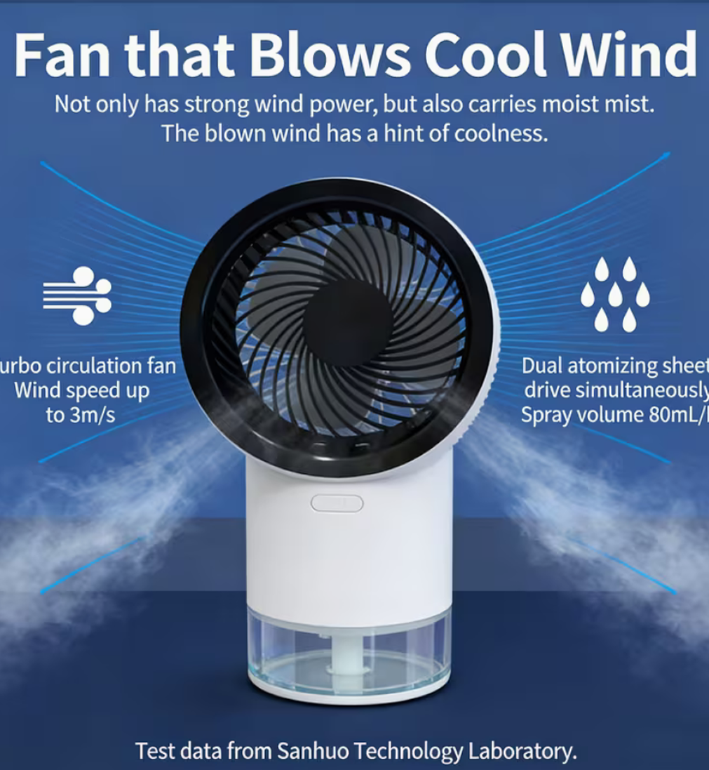 Fraîcheur “Coup de Glace” : En remplissant le réservoir avec de l’eau froide ou en y ajoutant des glaçons, vous abaissez la température de l’air de plusieurs degrés pour un soulagement immédiat.