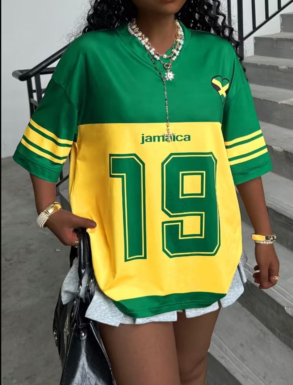 Affirmez votre style avec ce t-shirt streetwear oversize inspiré de la Jamaïque, une pièce forte qui ne passe pas inaperçue. Son design bicolore vert et jaune, associé au numéro 19 et au détail drapeau cœur, apporte une touche urbaine, moderne et pleine de caractère.